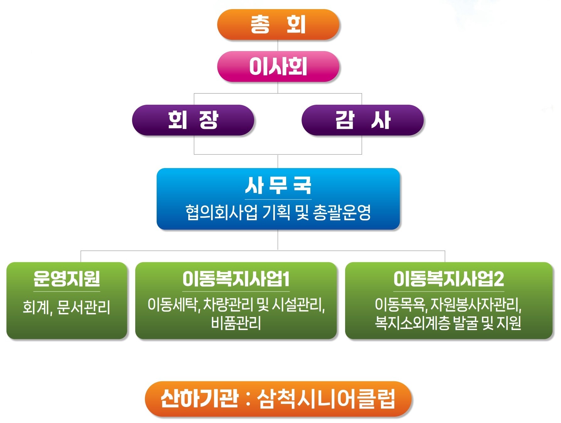 | 사무국장 | 이성희 | ○ 사회복지에 관한 교육훈련 및 홍보 ○ 사회복지에 관한 자료수집 및 간행물 발간 ○ 사회복지에 관한 조사연구 및 정책건의 ○ 정부, 자치단체, 사회복지협의회 위탁사업 운영 ○ 사회복지시설 기관, 단체 간 연락조정 및 협의 ○ 자원봉사활동 진흥 및 인증관리센터 운영에 관한 사항 ○ 사회복지에 관한 기부문화 조성 ○ 사회복지에 관한 학술도입 및 국제사회복지단체와의 교류 ○ 법인관리(총회, 이사회, 정관, 예산 등) ○ 삼척시사회복지대회에 관한 사항 |